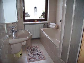 Bad mit Badewanne und Dusche Wohnzimmer mit Couchgarnitur (Schlafcouch, 200x160) SAT-TV